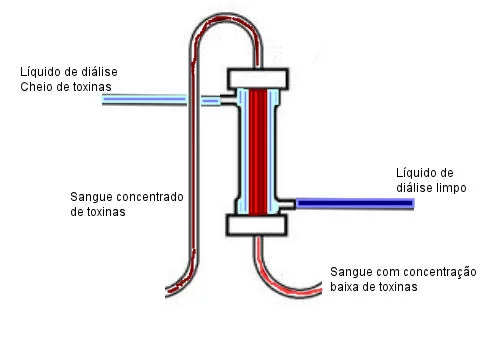 A hemodiálise é feita com a ajuda de um dialisador (capilar ou filtro). O dialisador é formado por um conjunto de pequenos tubos. Durante a diálise, parte do sangue é retirado, passa através da linha arterial do dialisador e vai para o capilar, onde o sangue é filtrado e retorna ao paciente pela linha venosa. Os banhos, formados por uma solução ácida e outra básica, que visam imitar o plasma limpo, entram através de conexões chamadas “hansen” em sentido contrário ao do sangue sendo que os banhos entram limpos e saem levando as toxinas que estavam no sangue.